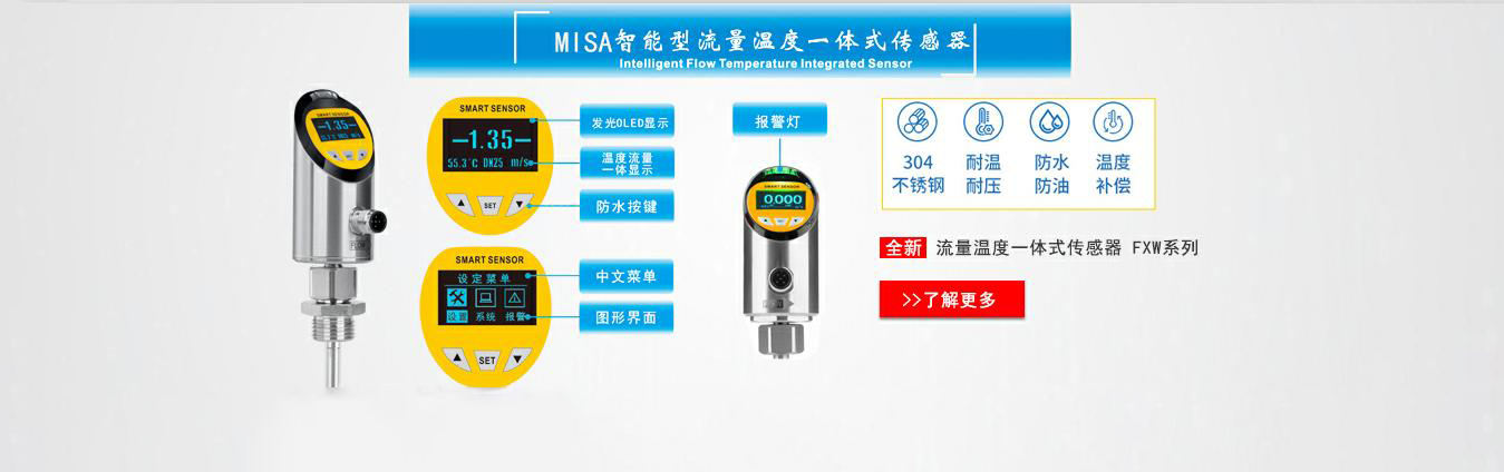 MS-FXN 流量溫度傳感器結構簡單、精確度高、安裝維修使用方便等特點,可對管道中的液體流動及溫度情況進行實時監控,提供流量4-20mA信號或者脈沖信號,報警開關輸出,溫度4-20mA信號及報警開關輸出,并采用OLED實時顯示流體流量及溫度,實現管道當中溫度流量一體式的監控功能。被廣泛應用于石油化工、電力、治金、鋼廠、造紙、食口品加工、水處理、電池廠等行業。